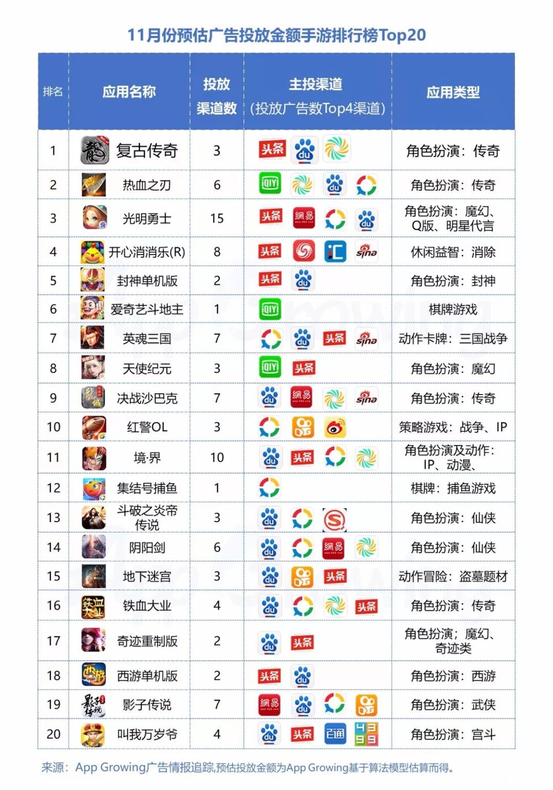 基于App Growing算法预估不同手游的投放金额,梳理出11月份预估广告投放金额游戏排行榜Top20,其中传奇类手游《复古传奇》及《热血之刃》分类第一及第二名。