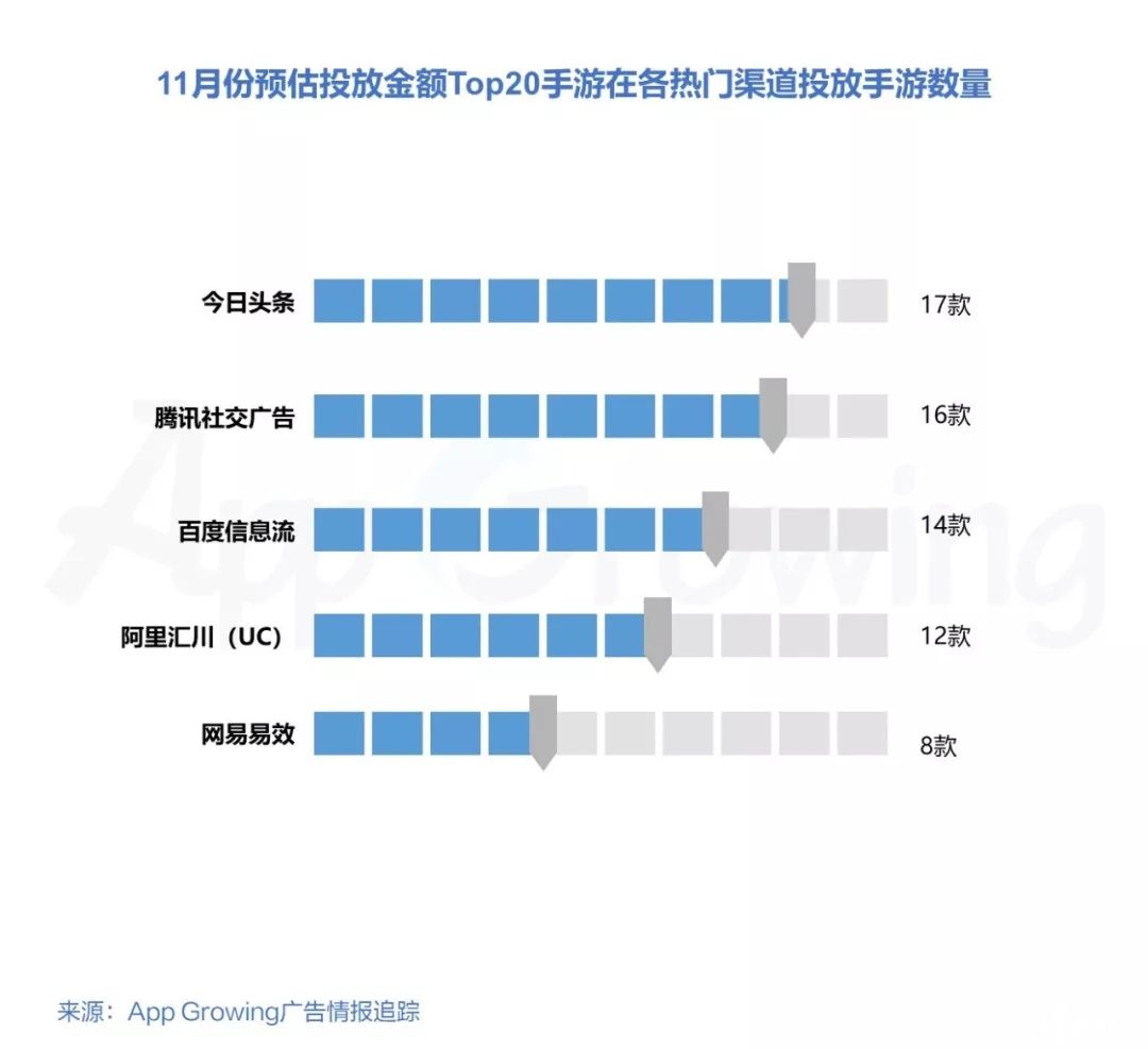 预估广告投放金额Top20手游中,有18款则同时投放了百度信息流,今日头条,阿里汇川这三个渠道。