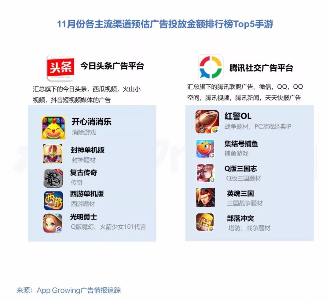 ③ 广告投放风云榜盘点:预估广告投放总金额Top20盘点,传奇类手游占据排行榜榜首,今日头条,百度信息流,阿里汇川依然为标配渠道。各主流渠道广告投放金额Top5盘点,RPG/策略游戏为主流。