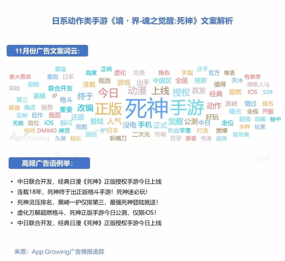 原版动漫名称“死神”、“正版”、“授权”、“原著”、“改编”等为其广告创意常用的高频词汇,强调其IP属性,吸引原动漫粉关注。其次,该游戏的游戏类型及风格-“格斗”、“二次元”也在文案中多次提及。