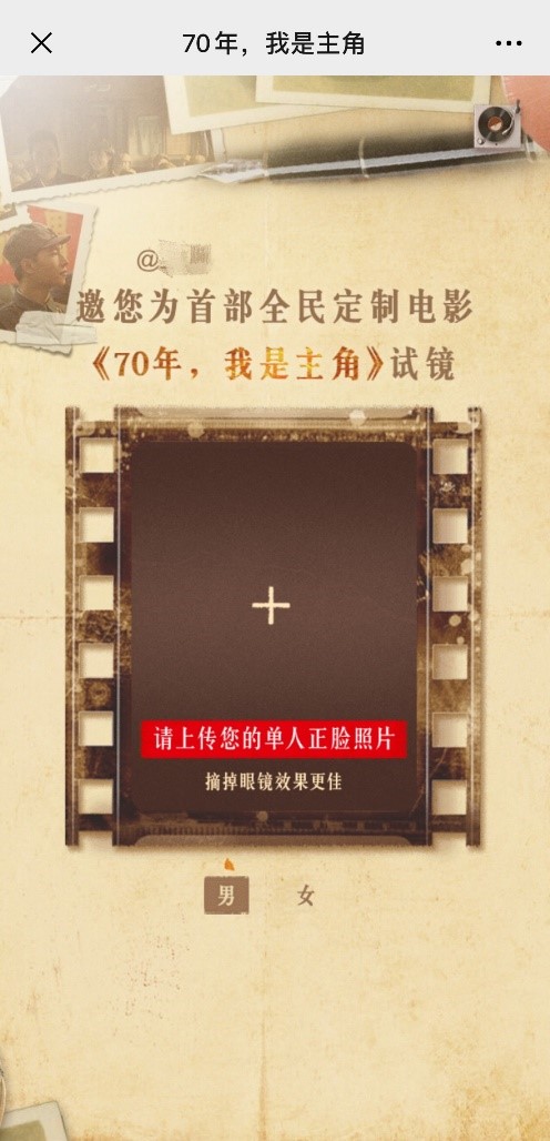 “打开人民日报APP‘热点’界面中‘70年,我是主角’,一键上传个人正脸照片、选择性别,即可成为主角。在这里,让人重温祖国的峥嵘岁月。以后我的履历上又可以加一项:曾与人民日报合作大片一部。哈哈。”