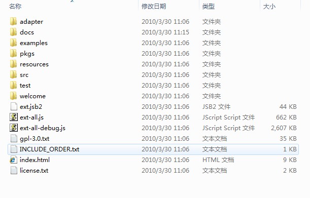 在进行是用extjs框架开发应运程序前,必须将extjs资源包导入到你的项目中来,最新的extjs开发包版本为3.2.0,在extjs官方网站可以进行下载,网址为。下载完成后,进行解压,解压后的结构图如下所示。