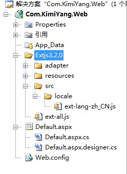 下载了extjs开发包后,我们就可以可以extjs的开发了,首先我们打开vs2008,新建一个工程,我就取名为com.kimiyang.web。建完工程后,将刚才解压后的extjs开发包拷到到项目中来。目录adapter,resources和文件ext-all.js必须拷到项目中来。我在工程的根目录新建了文件夹extjs3.2.0,然后将以上文件夹及文件拷到文件夹extjs3.2.0来。目录结构如下图所示: