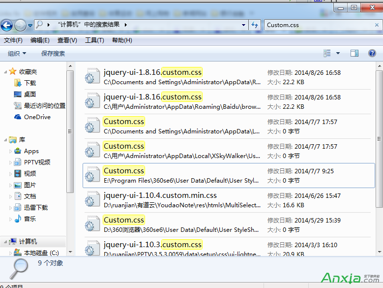 2:在“我的电脑”里查找“Custom.css”,找到相关文件。小编建议直接用搜索,之前小编找了很久都没有找到到。你会问小编,那么多个,那个才是呢?其实很容易看的,在“custom.css”下面,你仔细的观察一下会看到,有百度,360等等这些字眼,因为小编电视上有比较多流量器就会。找到chrome的custom.css。