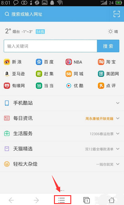 1.打开UC浏览器,点击属性按钮(最中间的虚拟键)。