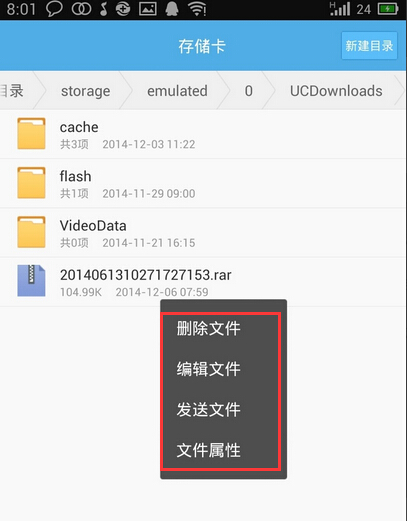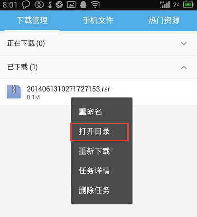 4.找到已下载文件里自己要找的文件按着不动,就会出现一个列表。点击"打开目录"。