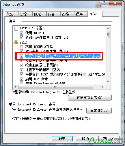 打开IE,选择“工具--internet选项”,切换到“高级”选项卡,找到“关闭浏览器时清空internet临时文件夹”,并将其选中,确定即可。