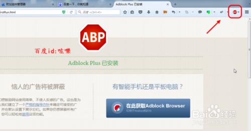 安装好之后,重启浏览器。如图菜单栏会出现abp的插件图标(如果是平板 安卓手机点击下方按钮)