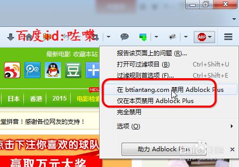 对于某些网站如果不需要屏蔽弹出,可以点击暂时禁用ABP或者在 选择xx站禁用即可。如下图