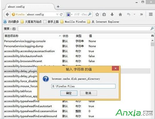 6:输入 字符串 的值 ,为你需要保存到的非系统盘路径(也可以和前面设置的路径一样),例如输入“ E:FirefoxFiles ”,之后鼠标单击“确定”