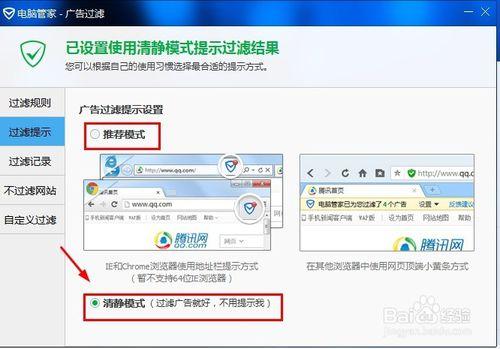 第二项是过滤提示,可以选择推荐模式跟清静模式。小编比较适合清静模式,果断开启。