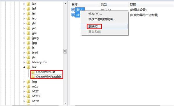 3、在.lnk下面有两个项openwithlist和openwithprogids,如果还有其他的项都删除,把这两个项内的子项删除。