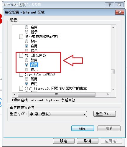 三、安全设置的Internet区域设置中,找到“显示混合内容”选项,将其默认的“提示”更改为【启用】,完成后点击底部的【确定】即可。最后会提示一个更改确认操作框,点击【是】就可以了。