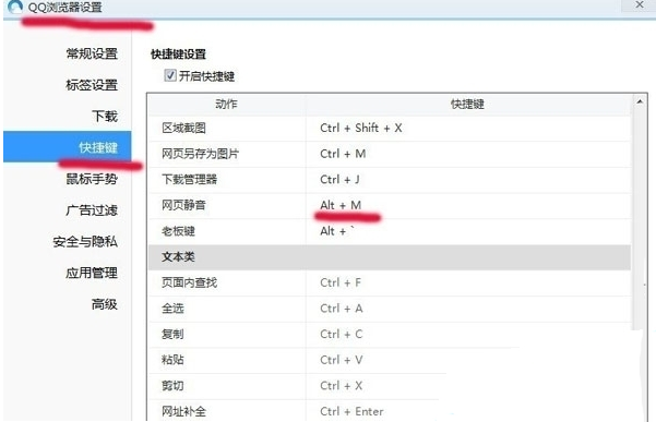 4、进入到快捷键设置,里面有一个关闭网页声音的快捷键,默认为ALT+M组合键,也可以设置一个常用的快捷键。
