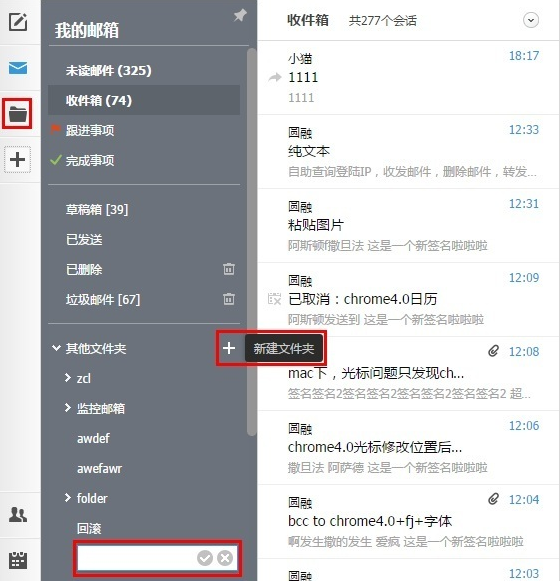 1、登录邮箱后,点击左侧“我的邮箱”,展开文件夹管理界面,在其他文件夹后面点击新建文件夹,输入文件夹名称勾选保存创建文件夹成功。