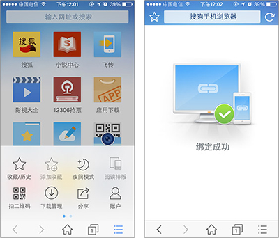 第三步:在搜狗手机浏览器中,点击“菜单”图标,在常用中选择“扫二维码”,扫描插件中展示的二维码。