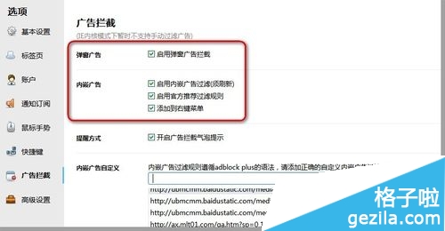【提醒方式】和【内嵌广告自定义】设置:提醒方式没啥好说的;内嵌广告过滤规则遵循adblock plus语法…没必要学什么语法,直接右键添加规则即可(具体见下图动画教程)~