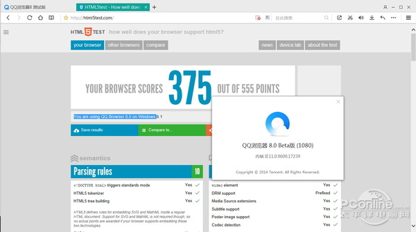由于是IE的马甲,因此QQ浏览器的HTML5测试分数跟系统安装的IE版本的分数一样