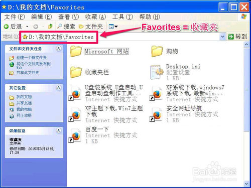 提示:图中的“收藏夹”就是Favorites。只是用中文表示更方便,如果在D盘下没有收藏夹,也可以创建一个,名字为中文的“收藏夹”即可。