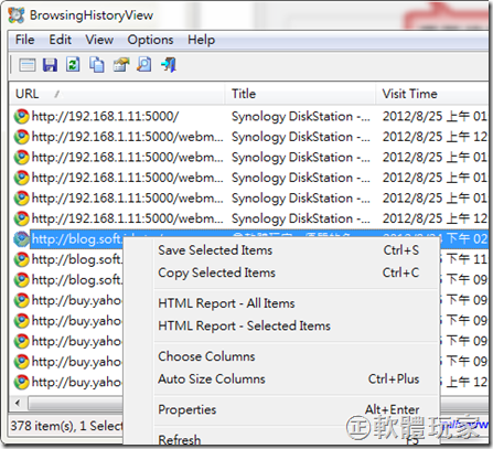 在浏览历史上方按下鼠标右键,可选择要保存、复制已选取的项目,也可将所有或选取的记录保存为网页报表(HTML Report)。