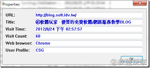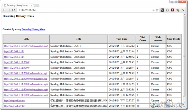 接着画面上会出现浏览历史的筛选结果。里面一共有六栏,包括了网址(URL)、网页标题(Title)、访问时间(Visit Time)、访问次数(Visit Count)、浏览器(Web browser)及使用者文档(Profile)。