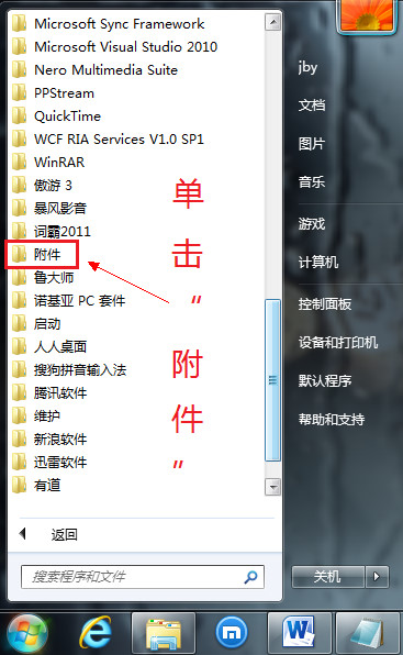 单击开始菜单中的“附件”