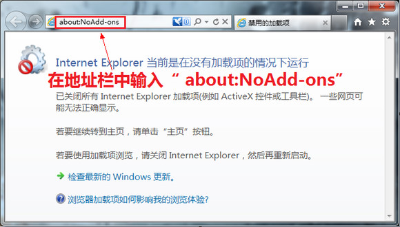 方法三:在 IE 地址栏中输入“about:NoAdd-ons”
