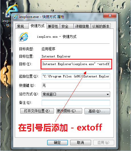 例如:"C:Program Files (x86)Internet Exploreriexplore.exe" –extoff,