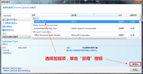 选择加载项,单击“禁用”按钮