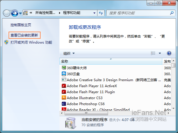 打开“控制面板”下的“卸载程序”,在点击最左侧的“查看已安装的更新”,找到KB2670838,双击进行卸载即可。