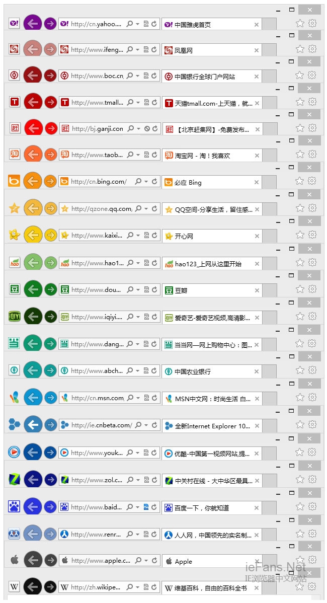 有网友利用网站固定后浏览器前进和后退按钮会变色的特性,制作了这张多彩的颜色渐变图片。小编看了以后表示压力山大,不得不佩服这位网友的想象力,感叹原来IE固定网站的功能还可以这样玩!