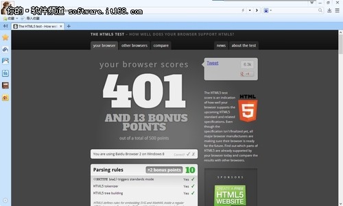 HTML5似乎已经成为目前浏览器的主流标准协议,包括IE10、Chrome、Opera、Safri,以及国内大多主流的浏览器都支持HTML5标准。HTML5 Test是一个在线的基准测试,它类似于ACID3,主要用来测试浏览器对HTML5的兼容性。该测试分数越高,则说明该浏览器对于HTML5标准支持程度越高。