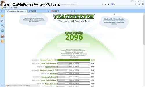 Peacekeeper是由著名测试软件Futuremark公司发布的一款免费网上测试程序,能够很好的说明浏览器的整体性能。该测试包括从HTML 5.0到CSS的各种网页标准,它还通过一些通用的算法评估浏览器的Javascript性能,同时还可以测试浏览器的DOM性能。测试数值越大,说明性能越好。这个测试的加载时间相对较长,但对浏览器速度性能的测试上也颇为全面。