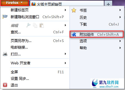 点击左上角的“firefox”按钮,在弹出的菜单中点击“附加组件”