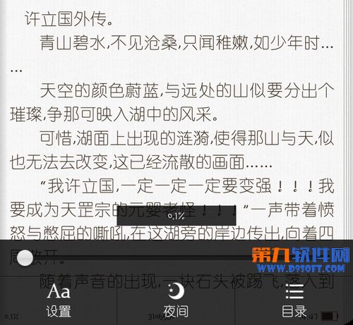 点击返回或者点击小说阅读器可以进入书籍列表,点击具体的书籍可以直接进行阅读。这里面的功能和大多数的阅读器相差不大,夜间模式,划词分享,生成目录,字体大小,都可以支持!
