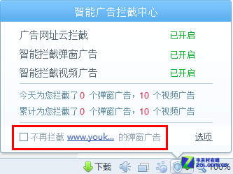 当然如果你不希望屏蔽某个网站的视频广告(谁会这么干?),也可以将该网站放进白名单中。方法也很简单,同样是在右下角的智能广告拦截中心里,选择不再拦截XXX网站的弹窗广告就行了。