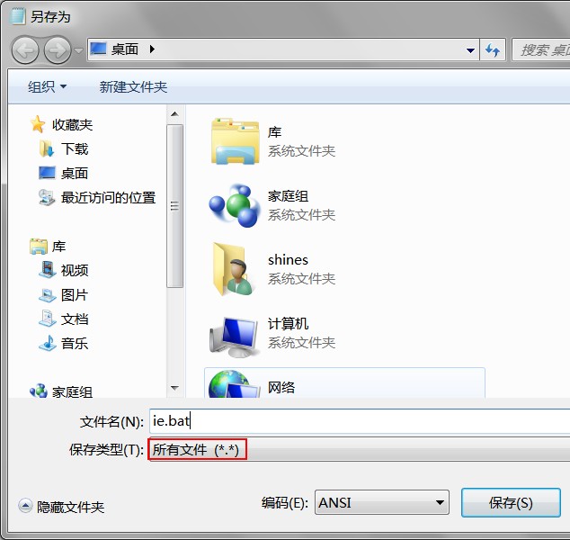 将文件保存至桌面,在保存类型中选择“所有文件”并将文件名改为bat的后缀名。