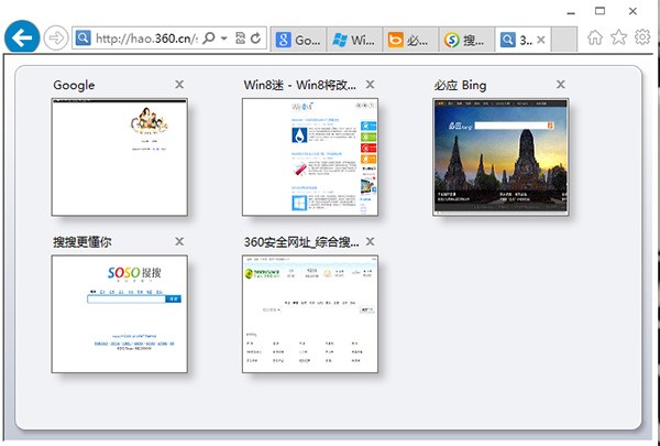 IE10浏览器-Internet选项-常规-选项卡-选中“启用快速导航选项卡”-确定-然后按住快捷键Ctrl+Q,就会出现导航界面。