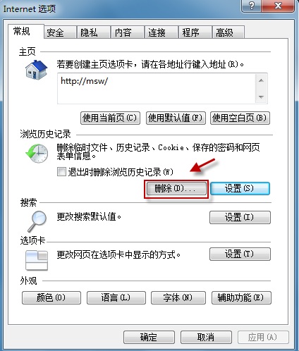 上面提到过,临时文件的空间是被你设定或是默认设定好的,满了会自动删除一些旧文件。不过,如果你担心病毒或者不想暴露网上行踪,定时删一删也是好的。在“常规”选项卡浏览历史记录一栏单击“删除”按钮即可。