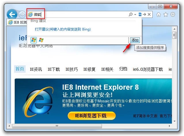 你应该会发现IE9跟IE8的不同,就是右上角的搜索栏位不见了。如果要显示搜索引擎的话,只要开个新窗口或分页,然后在网址栏输入要搜索的文字,按下〔Enter〕即可搜索。因为预设只有微软的Bing搜索引擎,因此你在搜索时按下搜索列右边的「添加」,就可以加入其他的搜索引擎了。