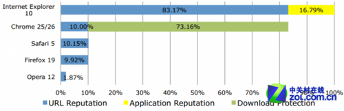 这项测试的运行平台为统一的Windows 8虚拟机,测试样本分别为IE10、Chrome 25/26、Firefox 19、Safari 5和Opera 12。测试期间利用754个活跃和恶意的链接对各个浏览器进行分别测试,并统计出歌浏览器的过滤比例。