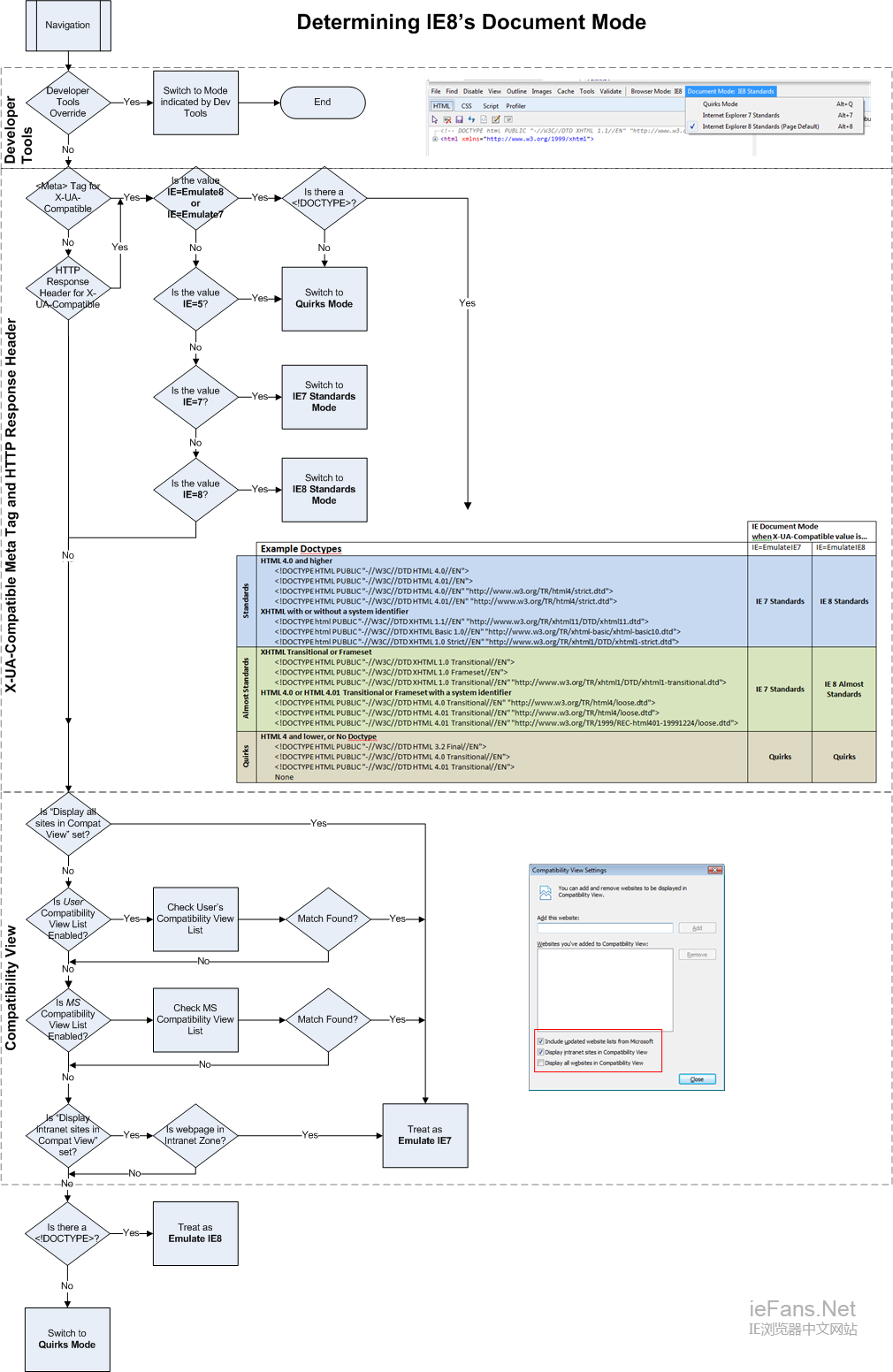 给定了以上的原则,这里有四条规则明确了IE如何处理文档类型(doctype),X-UA-Compatible meta标签和头部,开发人员工具,以及兼容性视图设置。这些标准自上而下出现在下面的图解中。