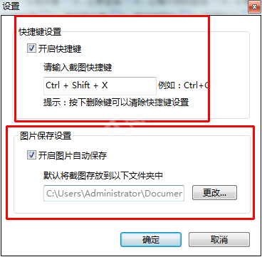 2、弹出截图设置框,设置快捷键、图片保存设置、截图存放路径