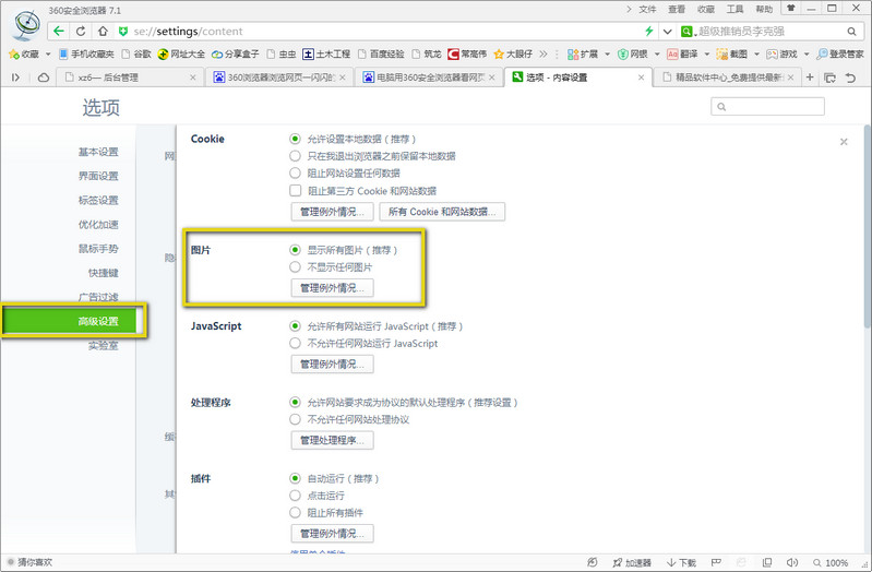 第三步:在高级设置里找到“网页设置”,在网页设置里(勾除)不显示图片