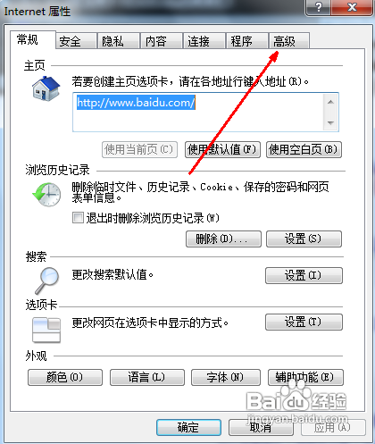 如果是IE内核的浏览器,那就点击工具--internet选项,在属性页中点击右上角的标签栏即高级。