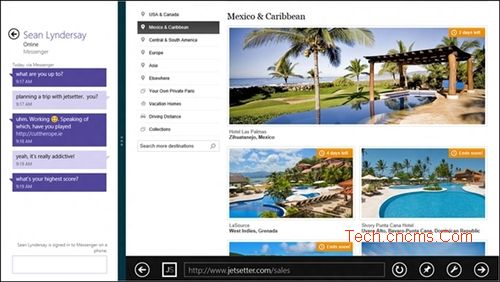 贴靠模式允许Windows 8 Style IE10可以与其他Windows 8 Style应用并排放置并运行在同一页面同一时间,这对需要多任务处理的用户来说意义非比寻常,因为在像iOS系统中同一个页面下运行多个窗口任务目前是不能实现的,如聊天的同时查看其中对方发来的链接,这样就不必跳出当前窗口,或在发邮件的同时查看地图、编辑日历等。