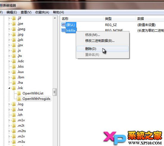 我们可以看在.lnk下,只留下openwithlist和openwithprogids两个项,其它全部删掉。