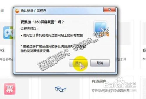 4.等待几秒钟后,在弹出的“确认新增扩展程序”窗口中点击“添加”按钮。成功在猎豹浏览器添加插件后便在插件栏显示并提示用户“360屏幕截图已添加到猎豹浏览器”。点击次插件图标便可以截图了。