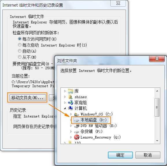 5、点击「移动文件夹」,再选择我们刚才建立的RamDisk虚拟硬盘即可,重新启动IE后就有效果了。