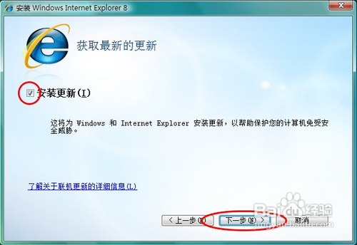 推荐您勾选“安装更新”选项,这样系统会在 IE8 安装过程中把一些相关更新与主程序一并安装。从而保证您安装后的 IE8 就是当前的最新版本。勾选完毕后点击“下一步”。